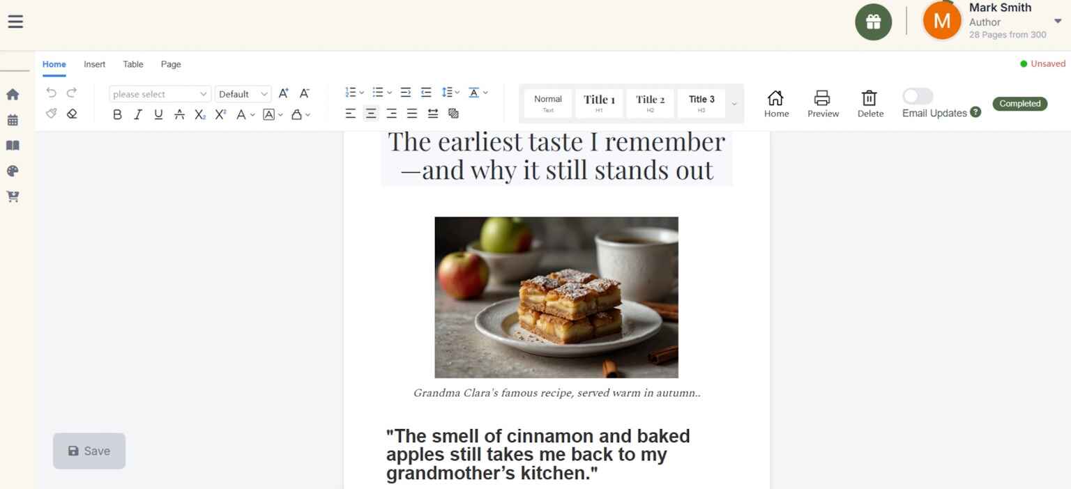Design your book exactly as you imagine it. Add tables, change fonts and colors, and customize every detail — the Tasteful Memories StoryCraft™ Editor built for storytellers of every age — flexible, intuitive, and beautifully simple.